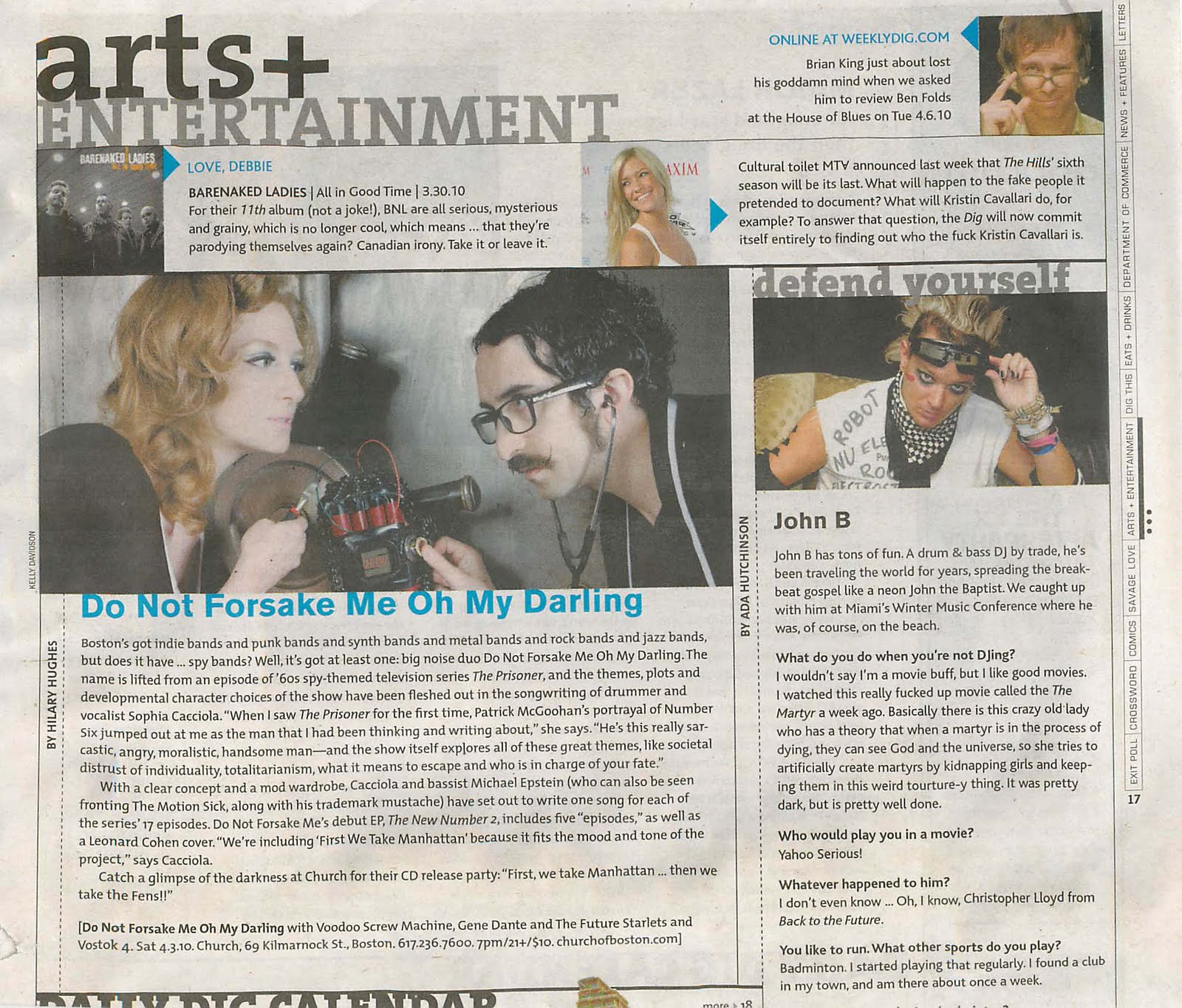 Hilary Hughes at The Weekly Dig (link to article) wrote up our concept: “Boston’s got indie bands and punk bands and synth bands and metal bands and rock bands and jazz bands, but does it have … spy bands? Well, it’s got at least one: big noise duo Do Not Forsake Me Oh My Darling. The name is lifted from an episode of ’60s spy-themed television series The Prisoner…With a clear concept and a mod wardrobe, Cacciola and bassist Michael Epstein (who can also be seen fronting The Motion Sick, along with his trademark mustache) have set out to write one song for each of the series’ 17 episodes….Catch a glimpse of the darkness at Church for their CD release party: “First, we take Manhattan … then we take the Fens!!”